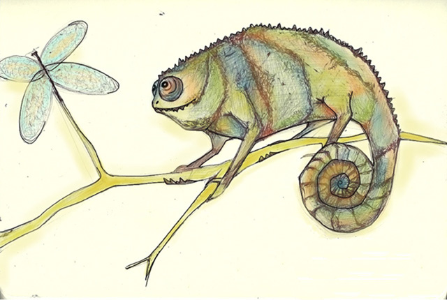 Illustration Friday’s topic of week, Intention, got me thinking of swivel eyes and long, gooey tongues. I used pen on paper and added color on Sketchbook Pro. I looked at him for a while and named him Bertie.